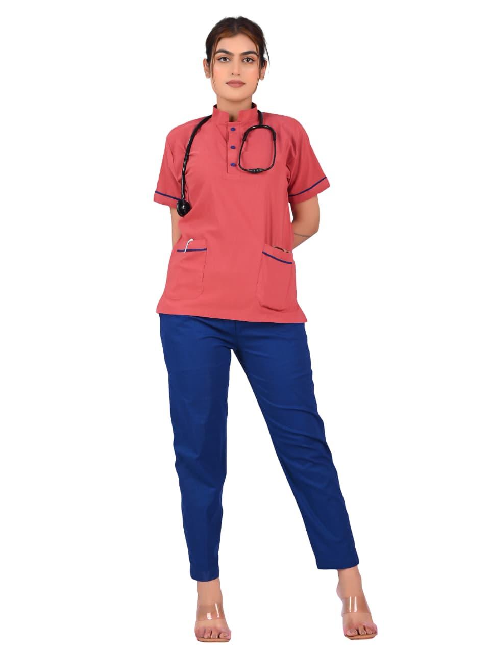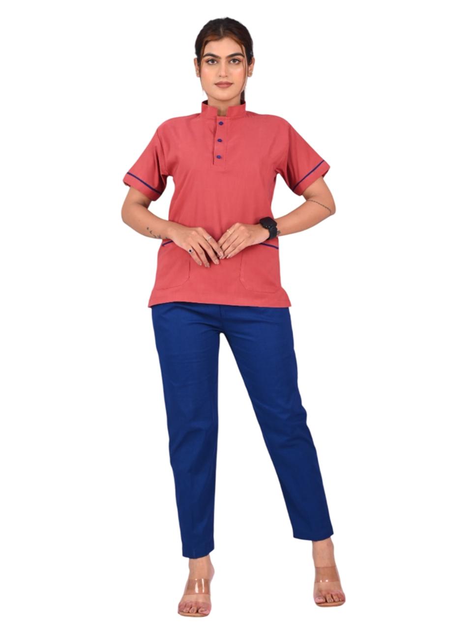 LUNAIN Female Dual-Tone Mandarin Collar Nurse Uniform offers a sleek and modern design with a coral red top, royal blue pants, and navy piping. Made from breathable, lightweight fabric for all-day comfort, it features a mandarin collar, buttoned front, and two front pockets for convenience. This uniform ensures a flattering fit while supporting ease of movement during long shifts. Machine washable, wrinkle-resistant, and built for daily clinical use.